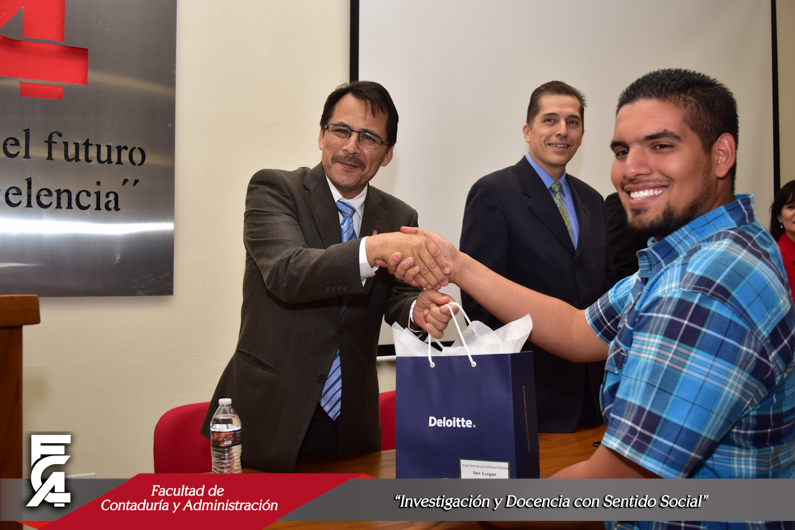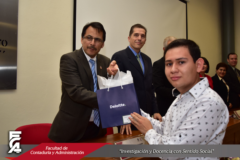 El día de ayer, la Facultad de Contaduría y Administración en conjunto con la firma Deloitte, reconocieron a los alumnos que obtuvieron los mejores promedios que cursan el 6to., 7mo. y 8vo. semestre de la Carrera de Contador Público de esta Facultad, el evento se llevó a cabo en el Auditorio del Edificio Académico de la FCA.