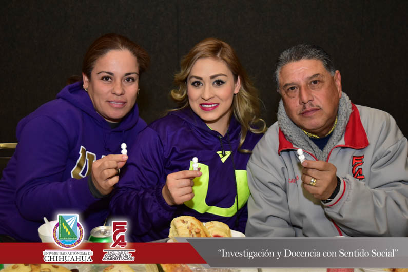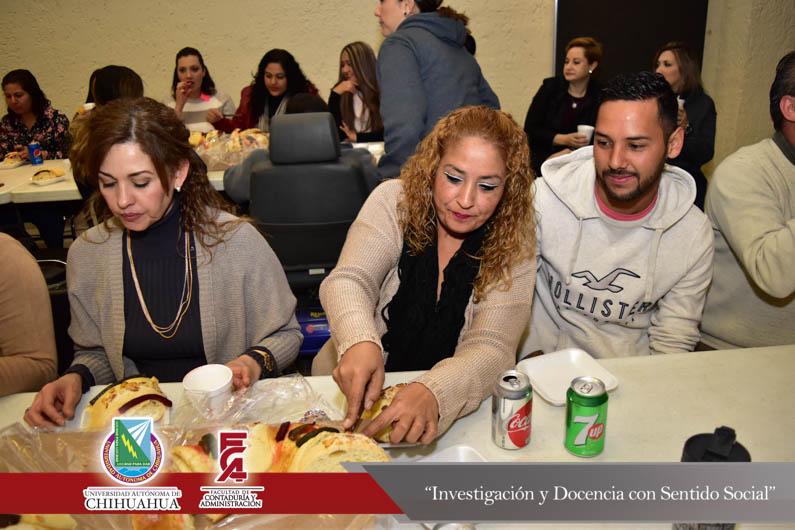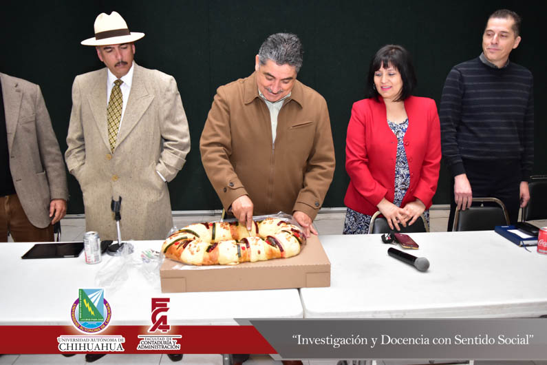 En un ambiente de armonía, compañerismo y fraternidad se llevó a cabo el tradicional corte de la Rosca de Reyes del personal administrativo de la Facultad de Contaduría y Administración de la Universidad Autónoma de Chihuahua. Ceremonia que fue encabezada por el Director de la Facultad, el M.F. Luis Raúl Sánchez Acosta, acompañado de la Dra. Carmen Romelia Flores Morales, Secretaria de Planeación y Desarrollo Institucional; el M.A.R.H. Ramón Torres Medina, Secretario Académico; el M.S.I. Marcelino Fraire Rodríguez, Secretario de Extensión y Difusión Cultural, el M.A.R.H. Servando Salcido Garza, Secretario Administrativo; el Dr. Juan Óscar Ollivier Fierro, Secretario de Investigación y Posgrado y el M.I. Germán Pérez Hernández, Coordinador General de las Extensiones de la F.C.A.