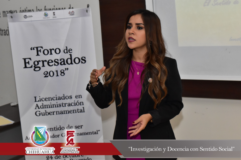 La conferencia fue impartida por la Licenciada en Administración Gubernamental, Martha Vianey Torres Avitia, con la ponencia denominada “El Sentido de Ser Administrador Gubernamental” en la cual se trataron temas de interés para los egresados propios del programa académico.